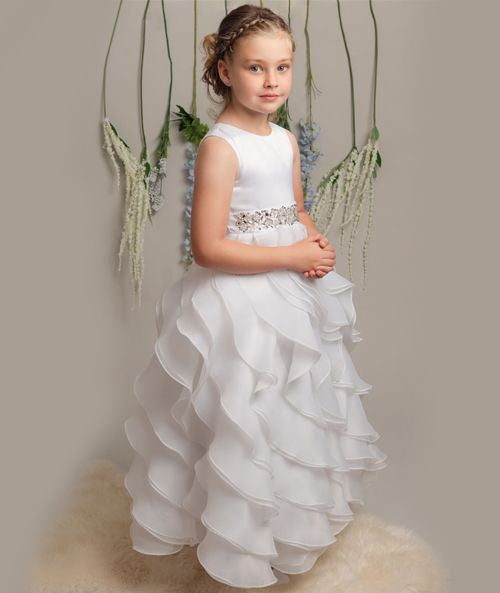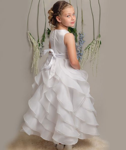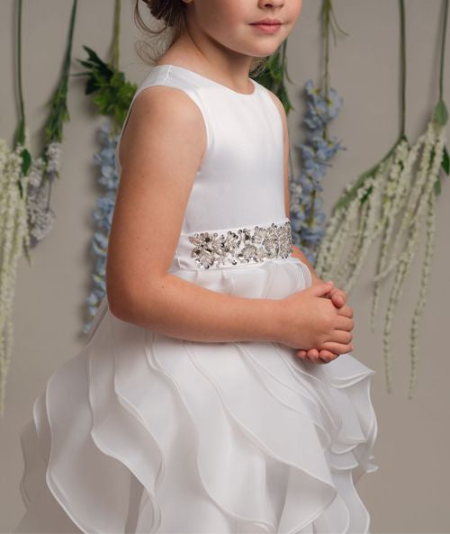 Gorgeous communion sleeveless dress with satin bodice with satin sequined and beaded sash that ties at the back. It has built up layers and soft edge finishing that ripples and flows , with a zip fastening at the rear