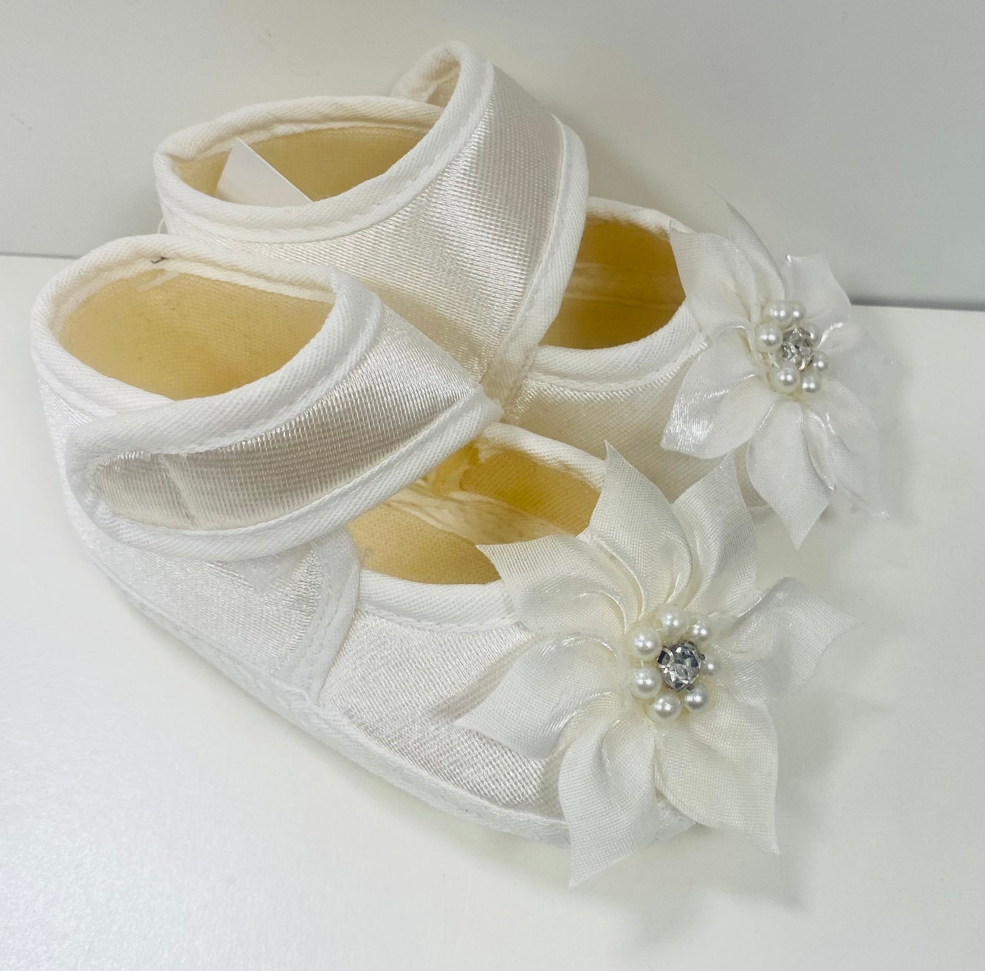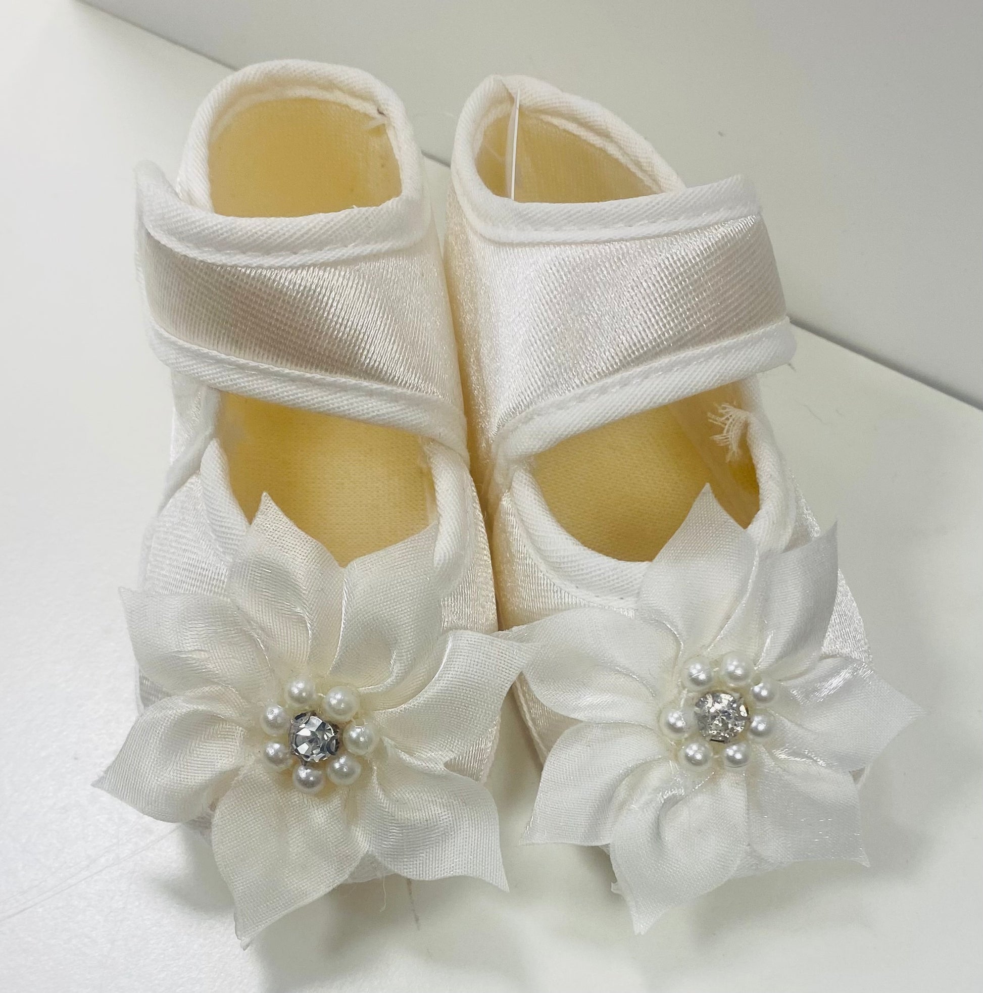 Girls petal, pearl and Diamonte slip on booties.