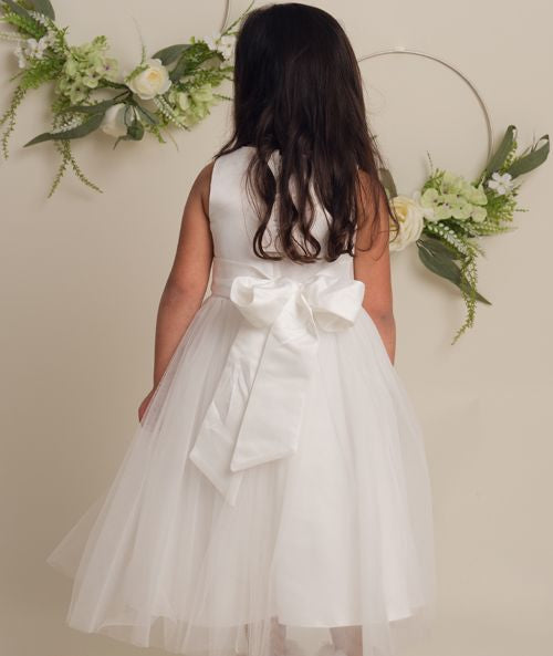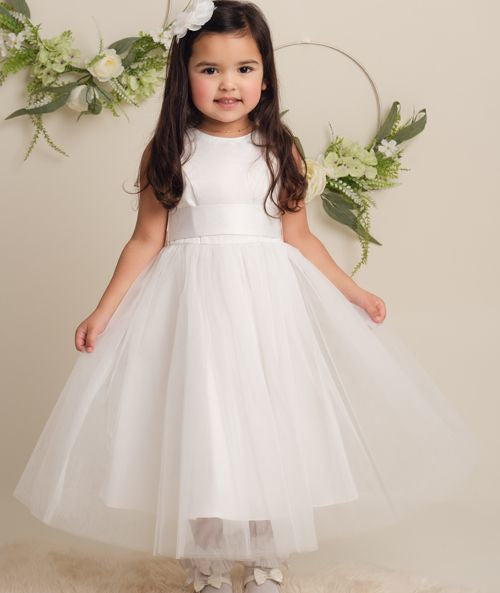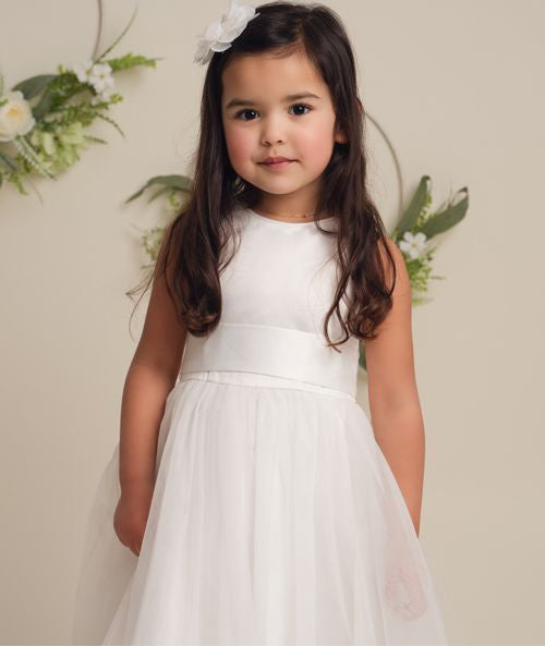 Pure elegant flower girl dress with a satin bodice and tulle overlay skirt. Features a detachable sash that can be easily replaced if needed to match your desired colour to the bridesmaids.