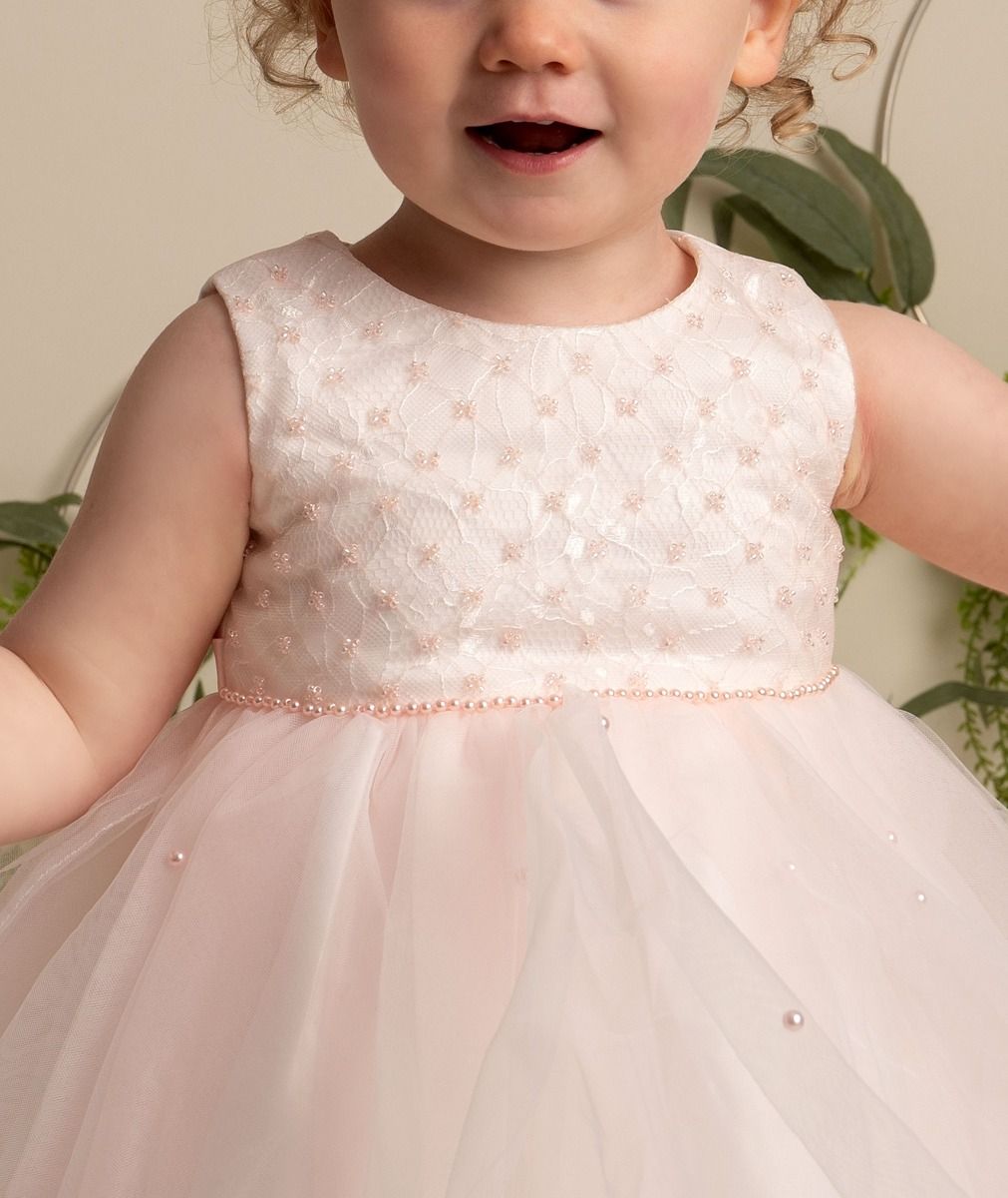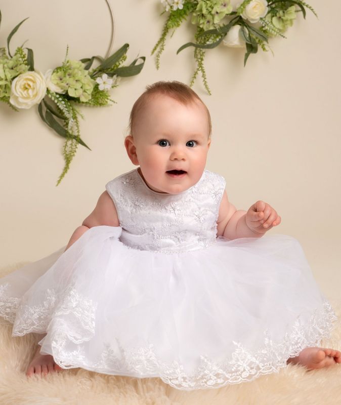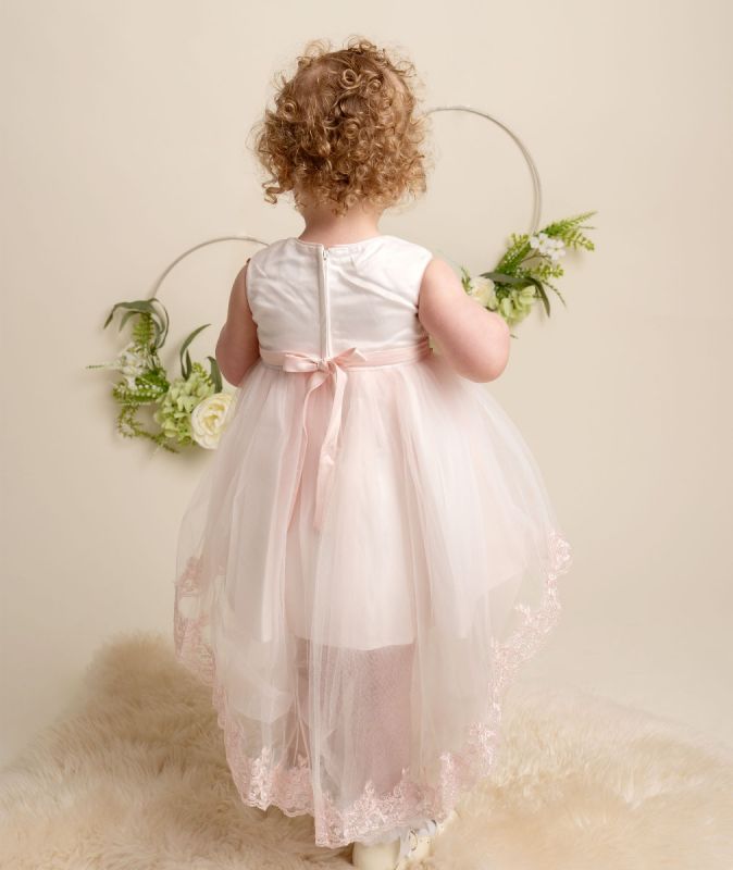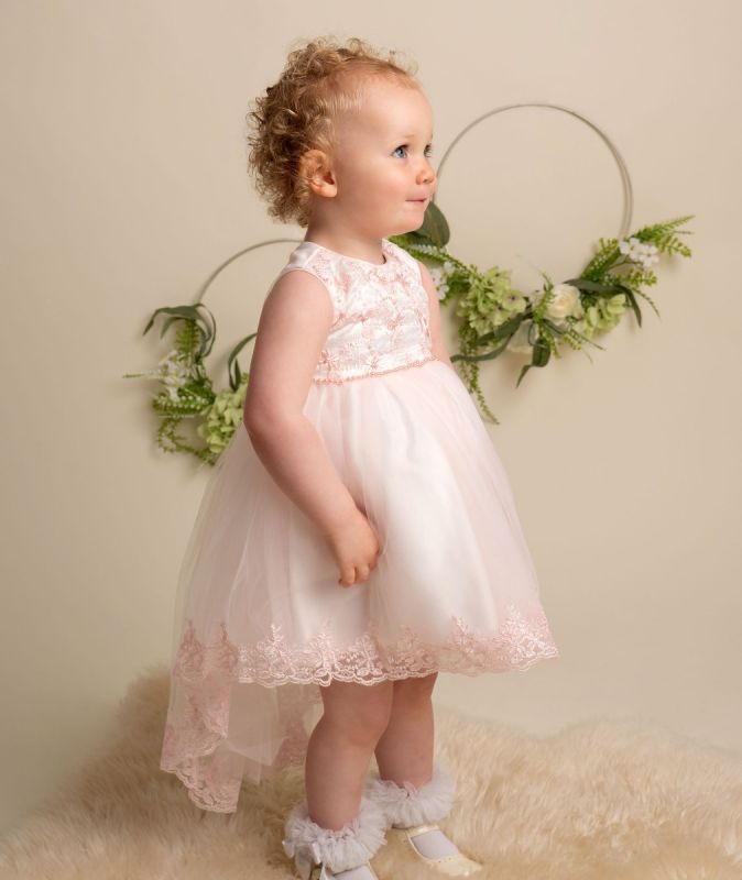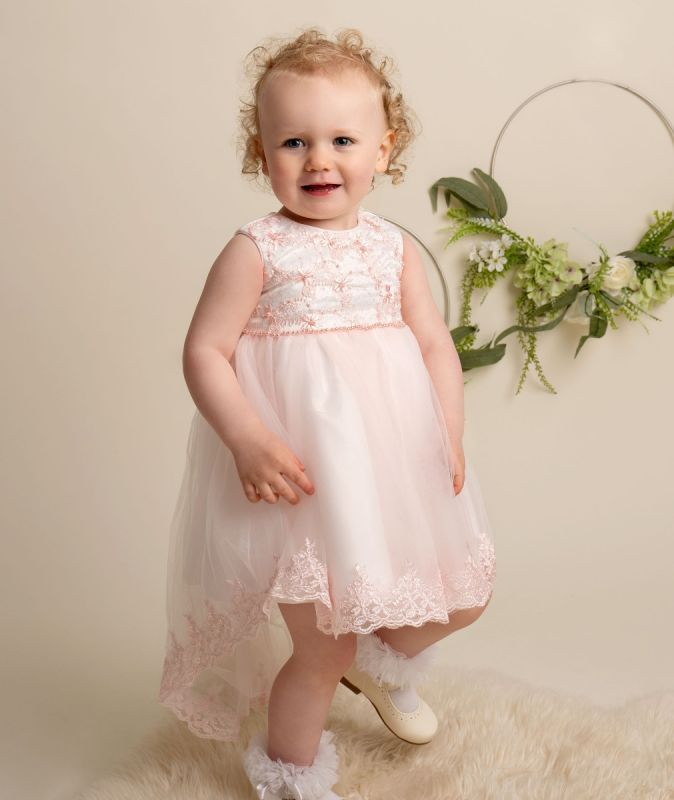 Girls christening dress with train. Available in white, ivory and blush. From 0/6mths-4yrs.