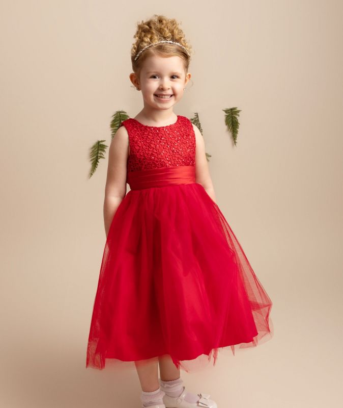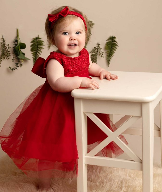 This beautiful dress has an embroidered bodice with sliver sequins on it, it also has a lovely full tulle skirt, around the waist line of this dress there is a gorgeous thick ribbon that ties in the back in a bow. The baby sizes come with a matching headband