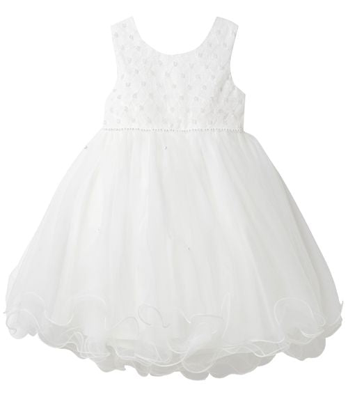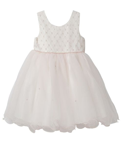 Knee length dress with a tulle skirt. It has a sequenced bodice with a pearl waistband and tie back sash from the sides.